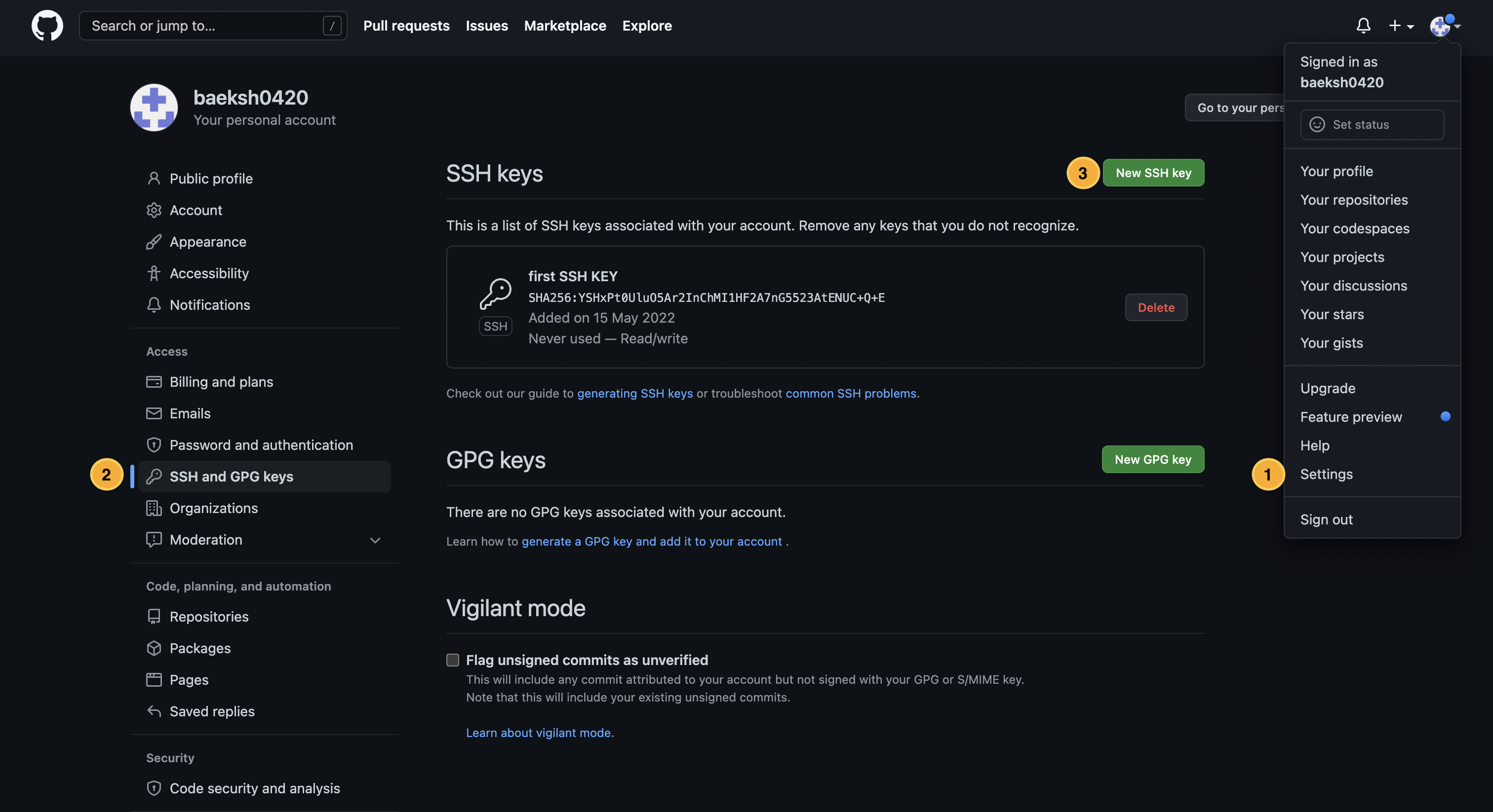 1. 깃허브에 해당 공개키를 복사하여 등록한다.