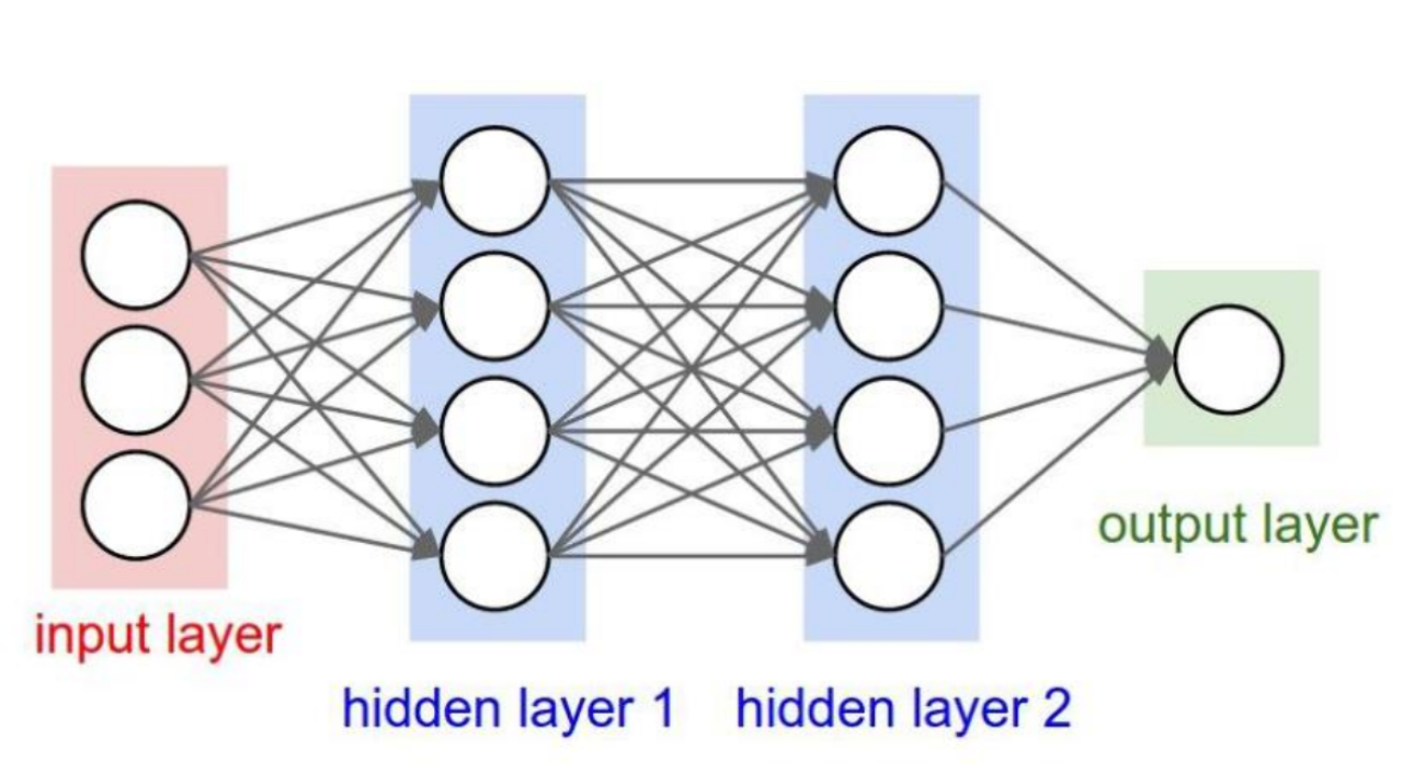 input 과 output 사이에 은닉층(hidden layer, 히든레이어)의 구조를 가지고 있다.