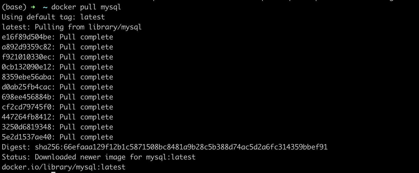 $ docker pull mysql // mysql:태그 를 지정해주지 않으면 가장 최신 버전이 다운로드된다.