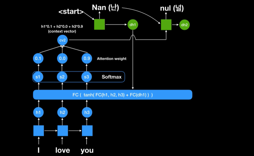 6. 다음 단어의 디코딩을 위해 인코더의 모든 히든층에 디코더의 히든스테이트를 같이 FC하여 다른 웨이트를 구한다. 이때 중요한 것은 계속 모든 히든층을 반복적으로 사용한다는 것이다.