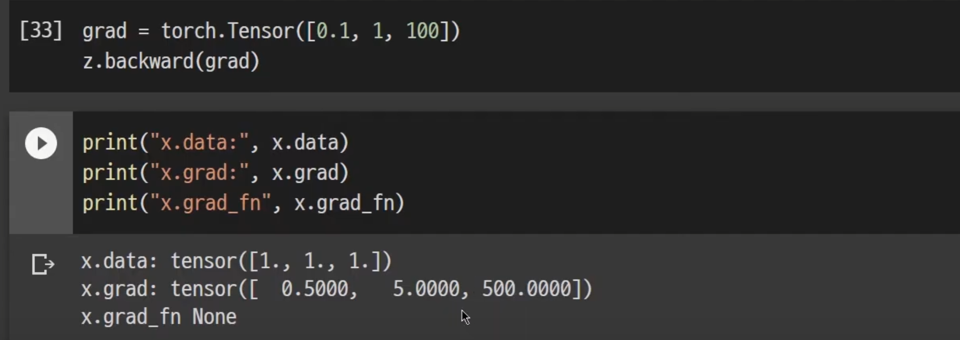- 계산 완료 후 호출하면, 자동으로 gradient를 계산하며 grad에 누적됨
